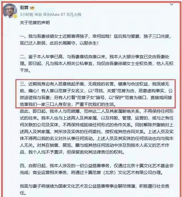 果然,在2025年12月11日,范曾本人微博发布声明,徐萌已经生子,范曾要与爱妻及儿子一家三口共度余生。范曾大师的内外事宜均交于徐萌处理。这个声明的第三条比较厉害,与范晓蕙,范仲达及其亲属断绝关系,并且生意也断绝来往。
