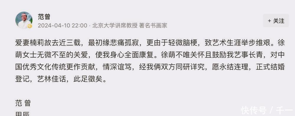 2024年月10日,范曾大师在微博发声,因爱妻楠莉去世将近三载,加上轻微脑梗,艺术生涯举步维艰。幸亏徐萌女士无微不至关爱照顾,使其身心健康。他俩双方研究,愿意共结连理,已经登记结婚。